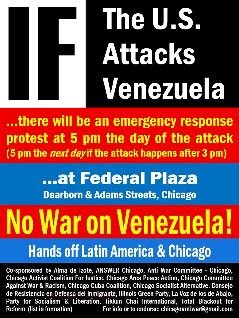 A large No War on Venezuela coalition of local groups has agreed on a protest plan in the event of a U.S. strike on Venezuela. We will gather at Federal Plaza in downtown Chicago at 5 P.M. on the day of the attack (or at 5 P.M. the following day, if the attack happens after 3 P.M.).